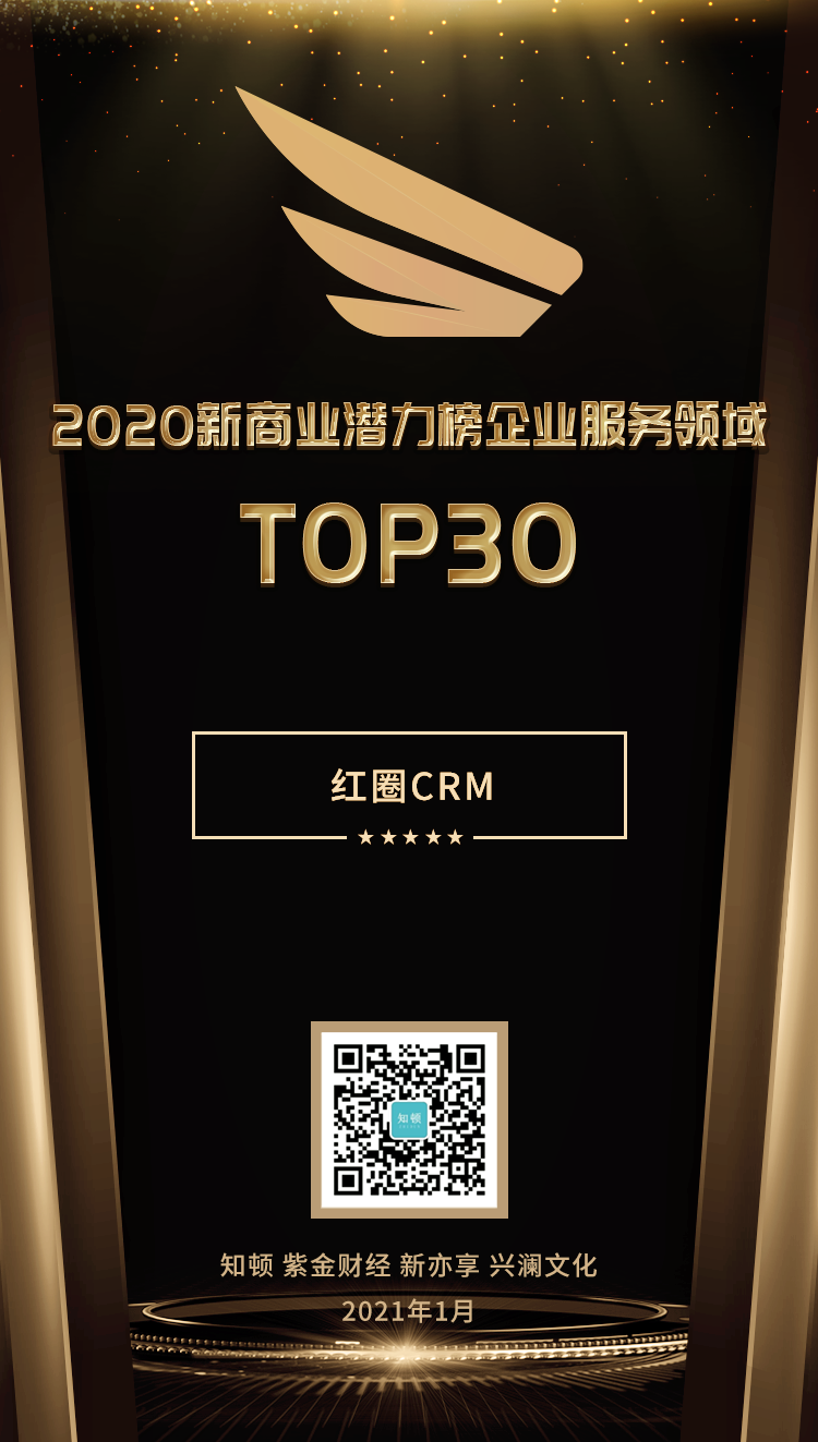 經過層層篩選,最終,紅圈CRM 創(chuàng)始人&CEO 劉學臣入選 “2020 新商業(yè)潛力榜人物TOP20”,紅圈 CRM 入選“ 2020 新商業(yè)潛力榜企業(yè)服務領域 TOP30”。