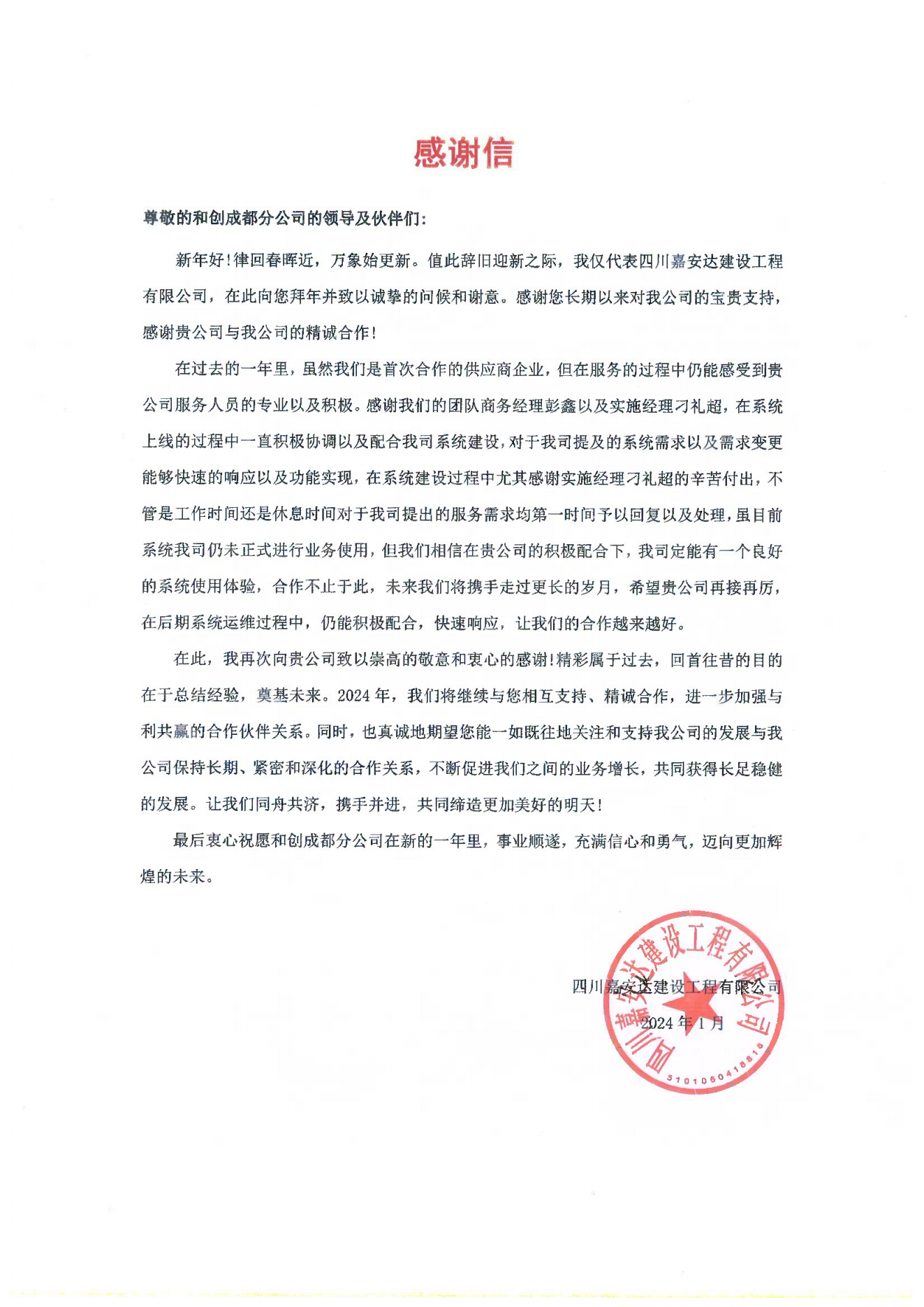 近日,紅圈團(tuán)隊(duì)收到了來(lái)自四川嘉安達(dá)建設(shè)工程有限公司發(fā)來(lái)的感謝信。