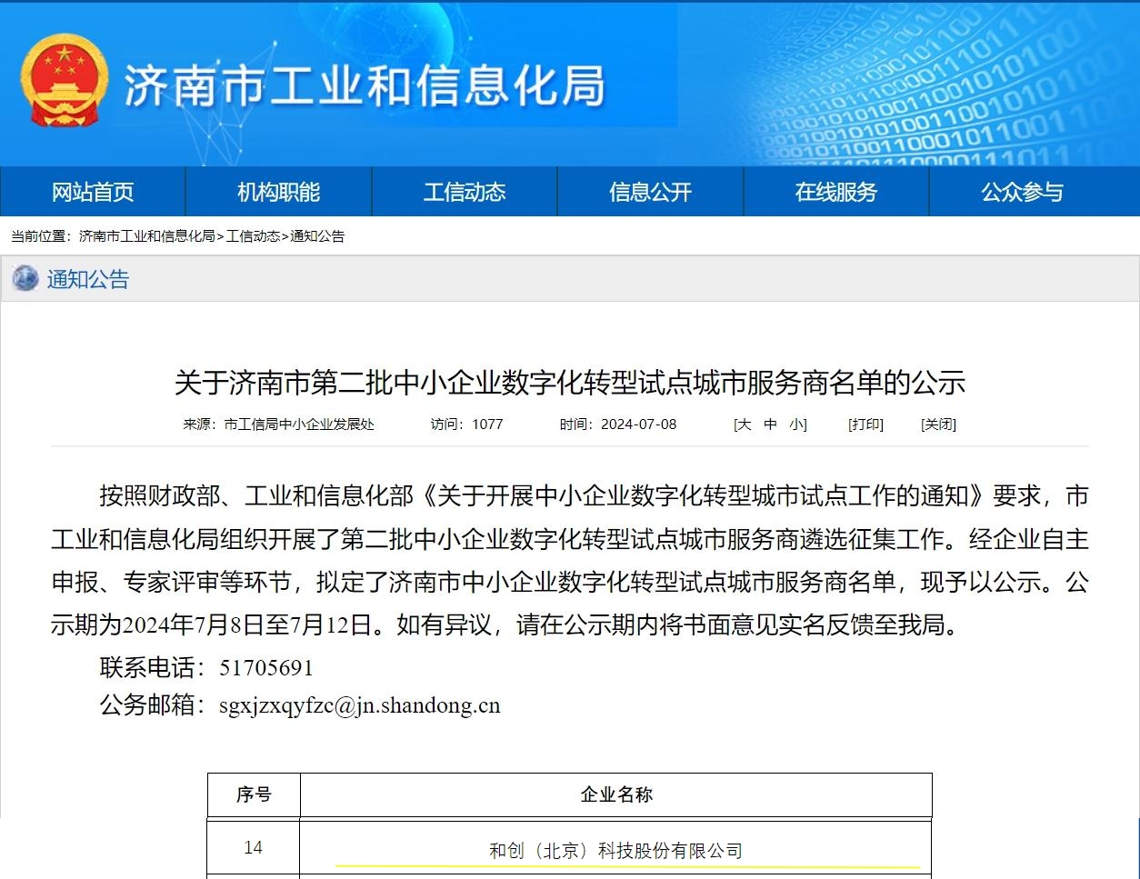 近日,濟南市工業(yè)和信息化局正式公布了濟南市第二批中小企業(yè)數字化轉型試點城市服務商名單,和創(chuàng)(北京)科技股份有限公司(以下簡稱“和創(chuàng)科技”)憑借其深厚的行業(yè)知識積累、卓越的SaaS系統(tǒng)實施能力以及完善的行業(yè)服務生態(tài),成功入選該名單,標志著和創(chuàng)科技在數字化轉型領域的實力和成就得到了官方的高度認可。