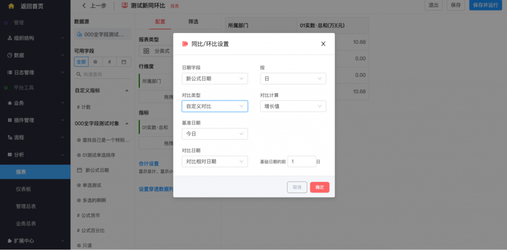 - 無時間維度的同環(huán)比設置,增加了自定義對比計算(相對日期和固定日期)