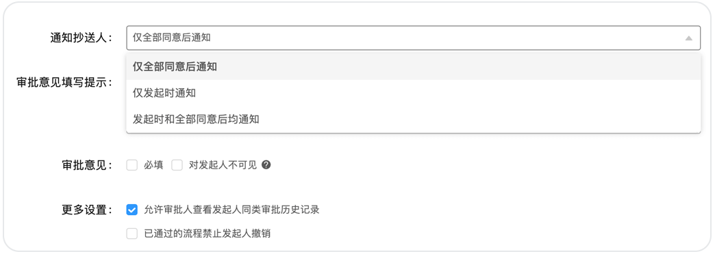 小王的出差報(bào)銷最終通過了,這時(shí)還需要抄送給辦公室的行政同事以便日后進(jìn)行成本分析。過去,報(bào)銷審批一經(jīng)發(fā)起就抄送給了行政同事,但有些審批后期撤銷了但沒有通知行政同事,造成后期分析時(shí)數(shù)據(jù)存在誤差,現(xiàn)在可以通過設(shè)置“僅全部同意后通知”的抄送模式來避免這一問題。抄送共有3種模式,企業(yè)可根據(jù)實(shí)際場景靈活選擇。