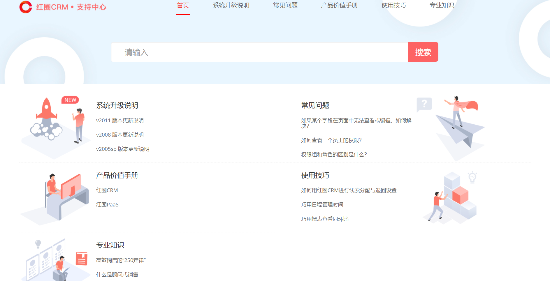 新版本增加了支持中心,包含版本更新說明、產(chǎn)品價值手冊、常見問題、使用技巧、專業(yè)知識。支持中心可以幫助用戶在使用紅圈 CRM 的時候?qū)λ懈钊氲牧私?。如果用戶對產(chǎn)品有任何建議和意見,也可以通過意見反饋提交給我們。
