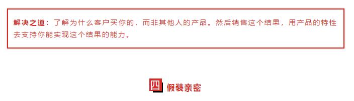無論是是否喜歡,那一刻,你在客戶心中的位置是"一個人正在向我銷售東西",你正在進(jìn)行一場激烈的戰(zhàn)斗來贏得信任。在這樣的環(huán)境下,你做的最錯的事情是通過一虛情假意的行為來套詞。