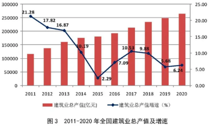 自2011年以來,建筑業(yè)增加值占國內(nèi)生產(chǎn)總值的比例始終保持在6.7%以上;2020年再創(chuàng)歷史新高,達到了7.18%。在2015年、2016年連續(xù)兩年下降后連續(xù)4年保持增長,建筑業(yè)國民經(jīng)濟支柱產(chǎn)業(yè)的地位穩(wěn)固。
