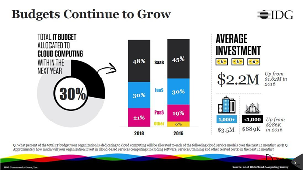 企業(yè)預(yù)計(jì)它們今年在云apps、平臺(tái)和服務(wù)中的評(píng)價(jià)投入為350萬(wàn)美元。在接下來(lái)一年預(yù)算的分配中,30%分配給了云計(jì)算,其中大部分是SaaS(48%)、IaaS(30%)和PaaS(21%)。同時(shí),對(duì)云計(jì)算應(yīng)用和平臺(tái)的投資也在快速提升,對(duì)此企業(yè)的平均投資額達(dá)到220萬(wàn)美元,高于2016年的162萬(wàn)美元。