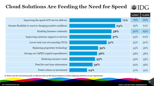 76%的大型企業(yè)正在尋求云應(yīng)用和平臺(tái)以加速IT服務(wù)的交付。多年來(lái),云計(jì)算已經(jīng)被視作是一個(gè)降低成本的優(yōu)先策略,現(xiàn)在它已經(jīng)成為數(shù)字化業(yè)務(wù)模式的推動(dòng)者。IT部門要求快速交付云應(yīng)用及平臺(tái)組件的期望與壓力從未如此之高。而云投資的目的是為企業(yè)帶來(lái)更大的靈活性,以及它們對(duì)不斷變化的市場(chǎng)環(huán)境做出反應(yīng)的能力(63%的全體受訪者對(duì)此表示同意),從而推進(jìn)數(shù)字化業(yè)務(wù)模式的實(shí)現(xiàn)。