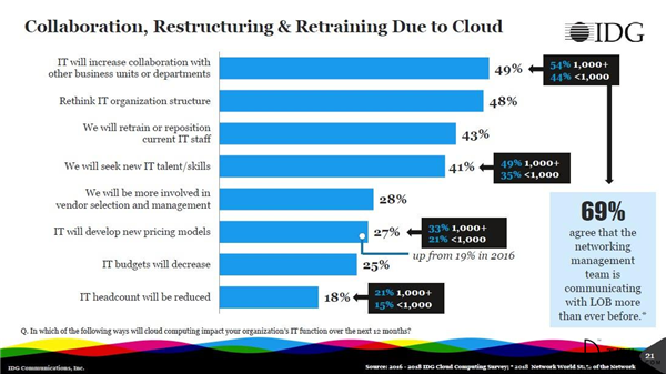 54%的大型企業(yè)表示,作為云投資的結(jié)果,它們必須增加與其他業(yè)務(wù)部門的合作。而在所有規(guī)模的組織中,48%的受訪者表示云迫使它們重新考慮自身的IT組織結(jié)構(gòu)。其他的變化包括留存和重新定位當(dāng)前的IT員工,雇傭更多的云技能人才,以及參與全新的供應(yīng)商選擇和管理體系中。