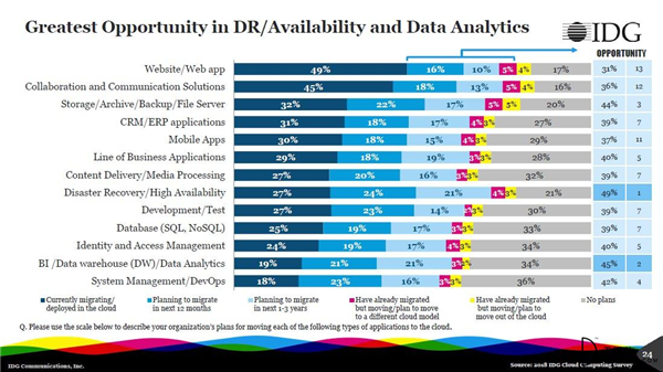 在所有的云應(yīng)用領(lǐng)域與遷移中中,數(shù)據(jù)分析和災(zāi)難恢復(fù)具有最大的機(jī)會(huì)。49%的組織計(jì)劃在未來(lái)一年到三年中將災(zāi)難恢復(fù)/高可用性系統(tǒng)遷移到云端。而45%的組織計(jì)劃在未來(lái)一年到三年中將BI、數(shù)據(jù)倉(cāng)庫(kù)和數(shù)據(jù)分析應(yīng)用遷移到云。目前,云計(jì)算正被視為一種增長(zhǎng)催化劑,它所支持的應(yīng)用程序正在消除企業(yè)收入增長(zhǎng)的障礙,并幫助它們?cè)诜€(wěn)定運(yùn)營(yíng)的同時(shí)獲得新客戶。