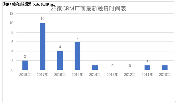 77家網(wǎng)上公開資料搜索到的CRM廠商中有25家是有明確的融資情況,從上圖我們可以看出資本越來越青睞于CRM領域,最新融資情況在2015年-2017年內(nèi)的廠商共有20家,占比為80%,商業(yè)模式的成熟、企業(yè)CRM認知的提高以及市場需求或許是資本青睞的主要原因。