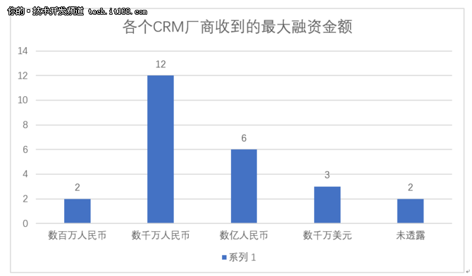 上圖總結了25家CRM廠商收到的最大融資金額, 我們將融資金額分為“數(shù)百萬人民幣”、“數(shù)千萬人民幣”、“數(shù)億人民幣”、“數(shù)千萬美元”以及未透露五個類別。其中12家公司收到最大的融資金額是數(shù)千萬人民幣。