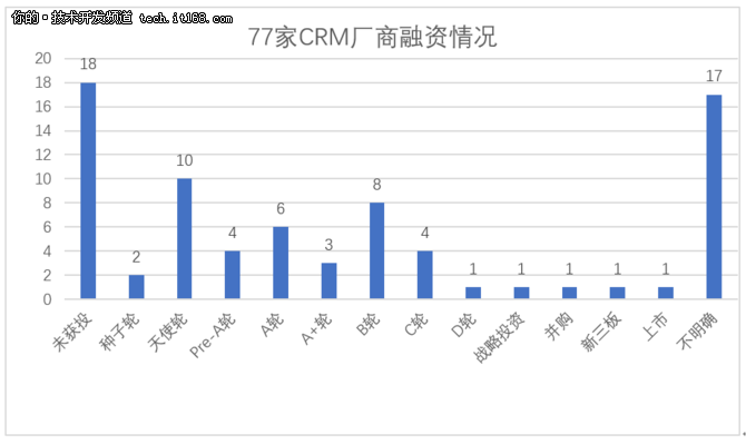 從77家CRM廠商的融資情況來看,除去17家融資情況不明確的廠商,有17家公司至今未獲投,B輪及B輪以前融資的公司有33家,占到總數(shù)的55%,相當一部分CRM廠商還處于創(chuàng)業(yè)初期。
