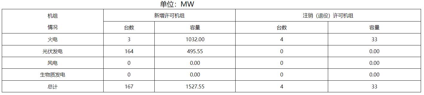 截止1月31日,2024年共辦理電力業(yè)務許可(發(fā)電類)業(yè)務17件,較去年同期增加21.4%,其中新申請5件,登記事項變更7件,許可事項變更3件,注銷2件。新增發(fā)電裝機167臺(發(fā)電單元)總容量1527.55MW,其中火電1032.00MW,光伏發(fā)電495.55MW。