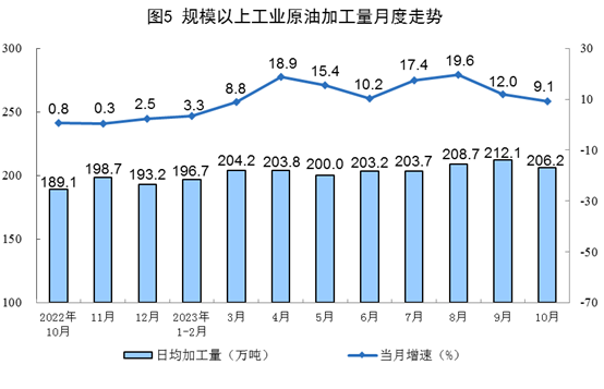 原油加工保持穩(wěn)定增長。10月份,加工原油6393萬噸,同比增長9.1%,增速比9月份放緩2.9個(gè)百分點(diǎn),日均加工原油206.2萬噸。1—10月份,加工原油61876萬噸,同比增長11.2%。