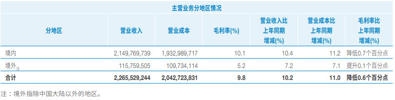 境外業(yè)務(wù)深耕經(jīng)營,新簽合同額1860億元,同比增長12.3%,營業(yè)收入1158億元,同比增長7.2%。