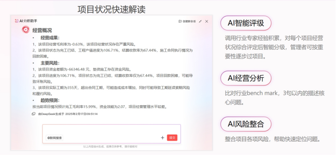 紅圈AI系列智能產(chǎn)品中的項(xiàng)目360°AI解讀,通過整合全維經(jīng)營指標(biāo),一鍵生成項(xiàng)目全景作戰(zhàn)圖,讓復(fù)雜數(shù)據(jù)轉(zhuǎn)化為清晰決策語言。該功能能夠?qū)?xiàng)目經(jīng)營狀況進(jìn)行智能評級(jí),并整合各項(xiàng)風(fēng)險(xiǎn),幫助管理者快速定位問題。通過結(jié)構(gòu)化呈現(xiàn)項(xiàng)目關(guān)鍵信息、收支分析、資金分析和成本構(gòu)成等數(shù)據(jù),項(xiàng)目360°AI解讀使項(xiàng)目進(jìn)度監(jiān)控更加精準(zhǔn)高效。這種透明化的進(jìn)度跟蹤,不僅提高了項(xiàng)目執(zhí)行效率,也降低了因延期導(dǎo)致的額外成本。