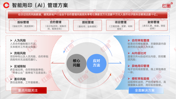 在企業(yè)的運營脈絡中,印章雖小,卻承載著沉重的法律責任與經(jīng)濟風險。面對合同協(xié)議繁多、應用場景復雜的業(yè)務環(huán)境,特別是對于建筑工程類企業(yè)而言,依賴人工管理的傳統(tǒng)用印模式已顯疲態(tài),在風險控制與運營效率方面捉襟見肘?;趯ㄖ袠I(yè)數(shù)字化進程的深刻洞察,紅圈軟件推出了「智能AI印控一體化解決方案」,旨在以科技創(chuàng)新驅動管理變革,引領企業(yè)實現(xiàn)用印流程全面、徹底的數(shù)字化與智能化轉型。