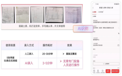 在工地,比扛鋼筋更累的是錄單據(jù)——合同、結算單、出入庫單,年輕技術員每天花幾小時對著紙質單據(jù)敲鍵盤,枯燥易錯,毫無成就感。紅圈AI深刻理解這些場景:成本專員需手動處理合同文本,逐頁閱讀并提取關鍵信息;施工班組每月提交的紙質結算單需逐條輸入系統(tǒng);單項目材料種類可達數(shù)千種,材料員需每天及時逐條輸入出入庫信息。