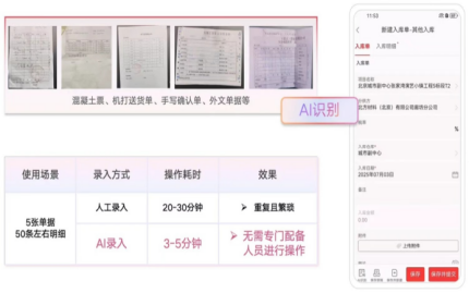 它靠大模型自動識別各類單據(jù)——混凝土票、機打送貨單、手寫確認單,連外文單據(jù)都能秒讀。關(guān)鍵字段自動提取,合同明細自動匹配,系統(tǒng)數(shù)據(jù)自動回填,減少90%的人工操作。入庫單進來,自動分析該掛哪個合同、哪項成本;結(jié)算單進來,自動歸集實際成本,溯源到每一筆采購。以前材料員錄單錄到眼花,現(xiàn)在“掃一掃”就完事。