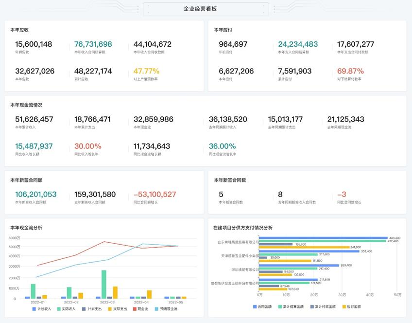 系統(tǒng)呈現(xiàn)公司級(jí)現(xiàn)金流看板+單項(xiàng)目收付款計(jì)劃/應(yīng)收/應(yīng)付/墊資等關(guān)鍵指標(biāo)的數(shù)據(jù)穿透 |