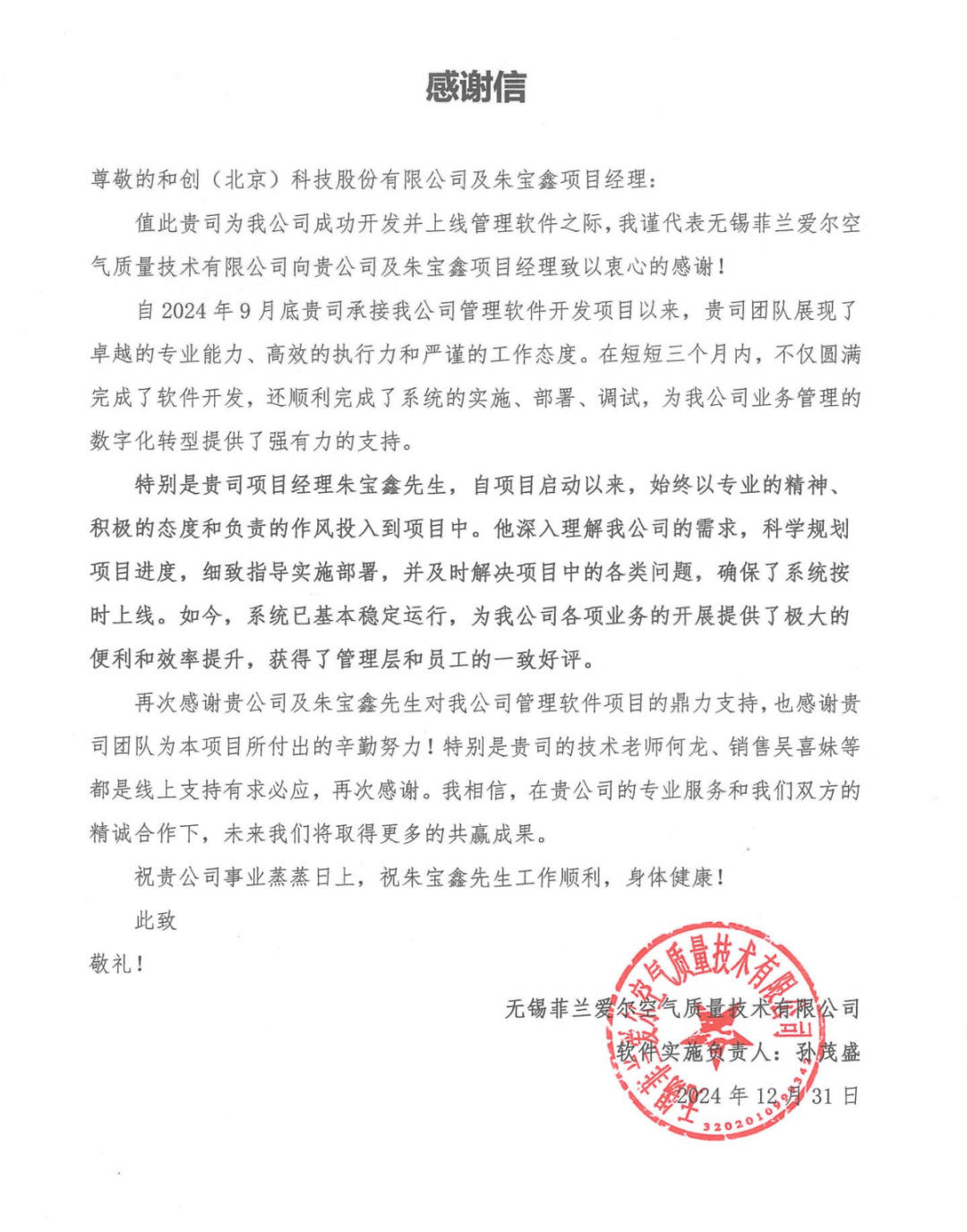 “貴司團(tuán)隊(duì)展現(xiàn)了卓越的專(zhuān)業(yè)能力、高效的執(zhí)行力和嚴(yán)謹(jǐn)?shù)墓ぷ鲬B(tài)度。在短短三個(gè)月內(nèi),不僅圓滿完成了軟件開(kāi)發(fā),還順利完成了系統(tǒng)的實(shí)施、部署、調(diào)試,為我公司業(yè)務(wù)管理的數(shù)字化轉(zhuǎn)型提供了強(qiáng)有力的支持?!?/span>