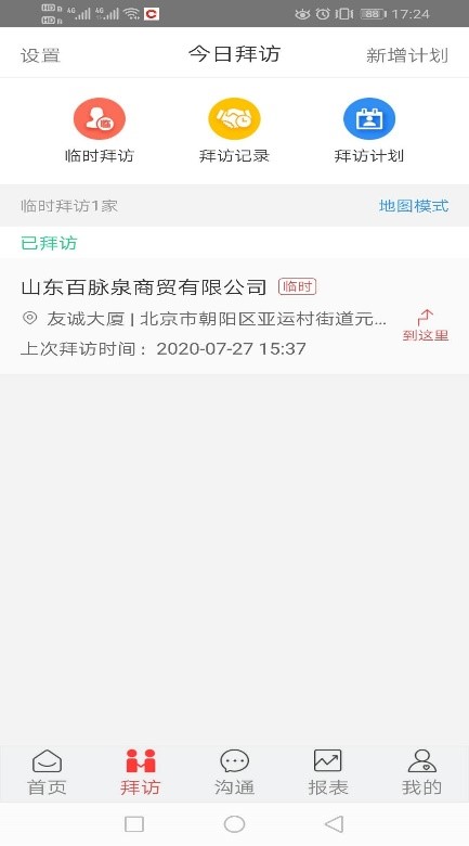其中臨時(shí)拜訪,可以直接開始拜訪,點(diǎn)擊需要拜訪的客戶,選擇拜訪流程,開始拜訪、提交拜訪匯報(bào)、點(diǎn)擊結(jié)束拜訪即可;