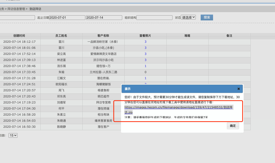 帶圖片數(shù)據(jù)可能會比較大,中等企業(yè)(500人以下)一個月驗(yàn)證生成壓縮包文件大小有幾百M(fèi)左右(主要是圖片太多占用空間),點(diǎn)擊導(dǎo)出以后記錄生成的下載鏈接一般15分鐘左右后可以開始下載,如果下載不成功說明文件還沒有生成完(數(shù)據(jù)庫查詢完數(shù)據(jù)再寫入Excel文件,包括寫入圖片,會比較耗時)。
