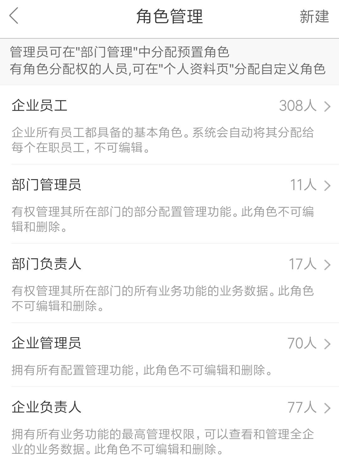 在角色管理中,會默認有五種角色:企業(yè)負責人、企業(yè)管理員、部門負責人、部門管理員、企業(yè)員工。